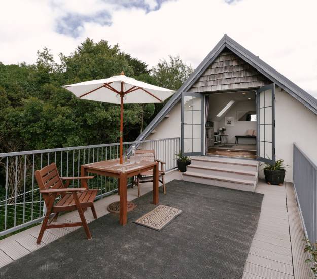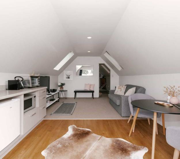 Separate to the main lodge is also our Tree Tops apartment. This has its own separate entrance and is fully self-contained which consists of a queen-size bed, kitchenette, open plan living and lounge area with a light and bright bathroom.